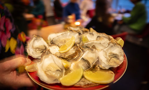 Onze borrelkaart nodigt uit om te delen, of juist niet. Oesters, huisgemaakte brioche met misoboter, oeufs mayonnaise, charcuterie en een wisselende selectie kazen. Combineer met een goed glas wijn en laat de middag vanzelf overgaan in de avond.